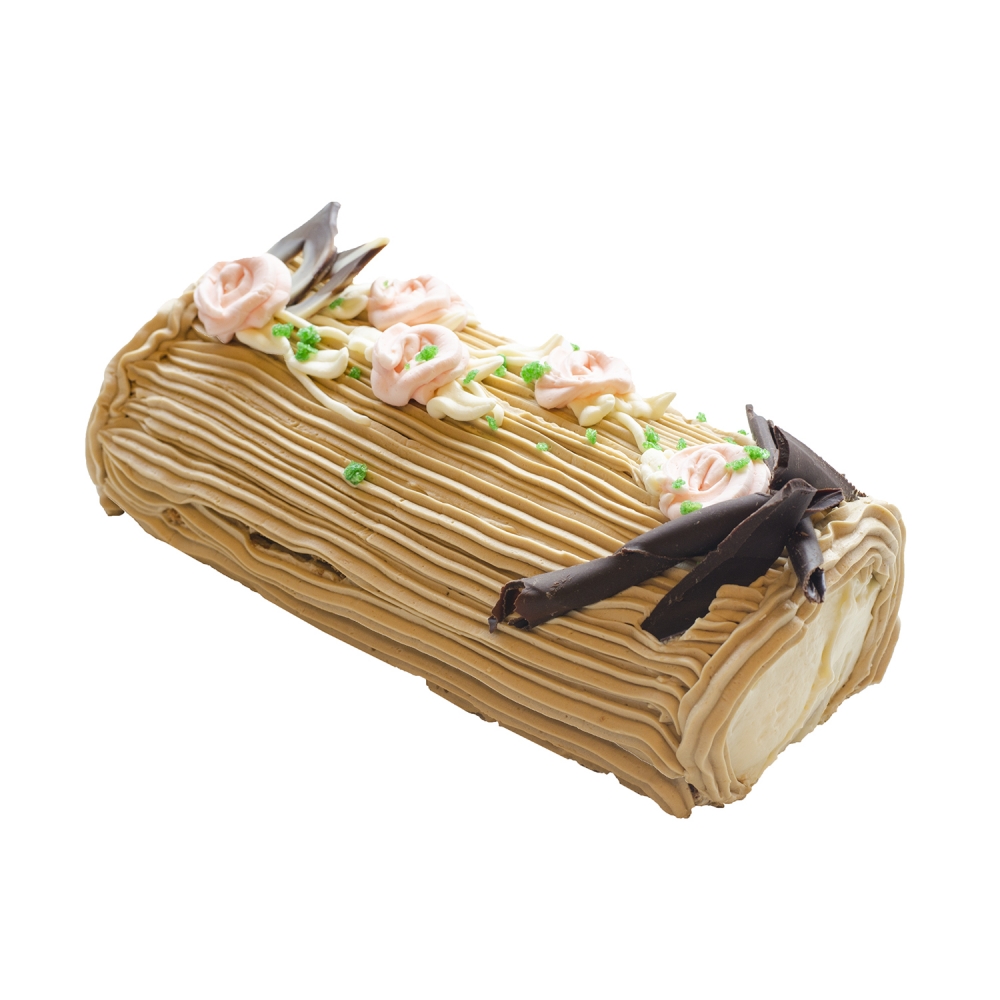 Een cakerol gevuld banketbakkersroom, afgewerkt met mokkacreme