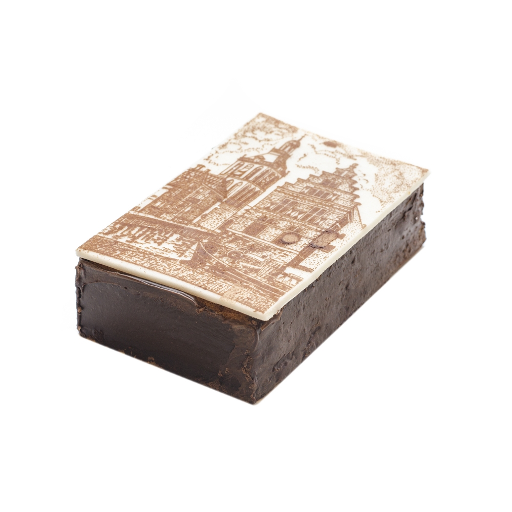 Een bicuittaartje van 15 bij 9 cm gevuld met pure chocolade ganache met een zeefdruk van pure chocolade op marsepein van de meppeler toren