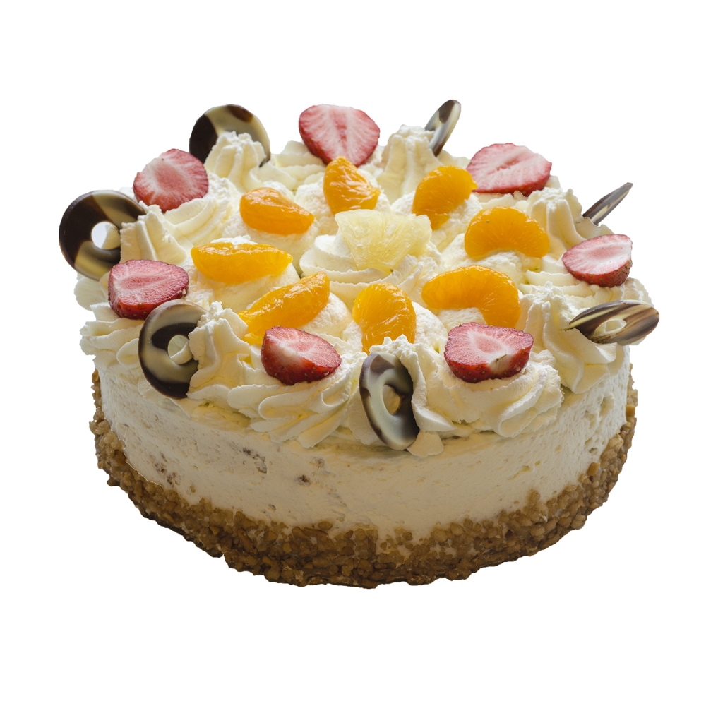 Een klassieke slagroomtaart met vers fruit en een luchtige cake.